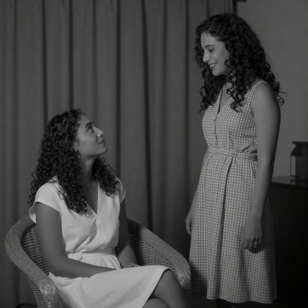 Black-and-white photograph. Two women in a kitchen. One woman sits on the floor under a kitchen island, wearing a patterned dress, looking slightly to the right. The other woman stands near a window, holding a phone, wearing a dress and heels. Kitchen island has bottles and a mirror. Wooden floor, cabinets, and a table in the background. The seated woman has wavy hair, the standing woman has short hair. Both women have neutral expressions.