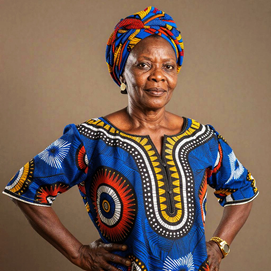 60 year old black woman in traditional African attire, intricate patterns, headwrap, confident stance, rich cultural background, warm natural light, vibrant colors, highly detailed portrait