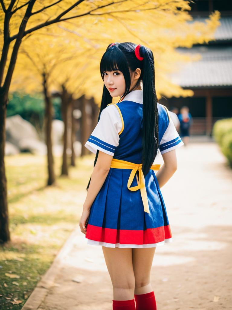Photo-realistic cosplay photo of person standing in monoko costume. 1girl, black hair, long hair, twintailsfull body shot. lifestyle stock photo, shallow depth of field, lifestyle stock photography, shallow depth of field, natural lighting, warm tones, soft background blur, vibrant colors, realistic textures