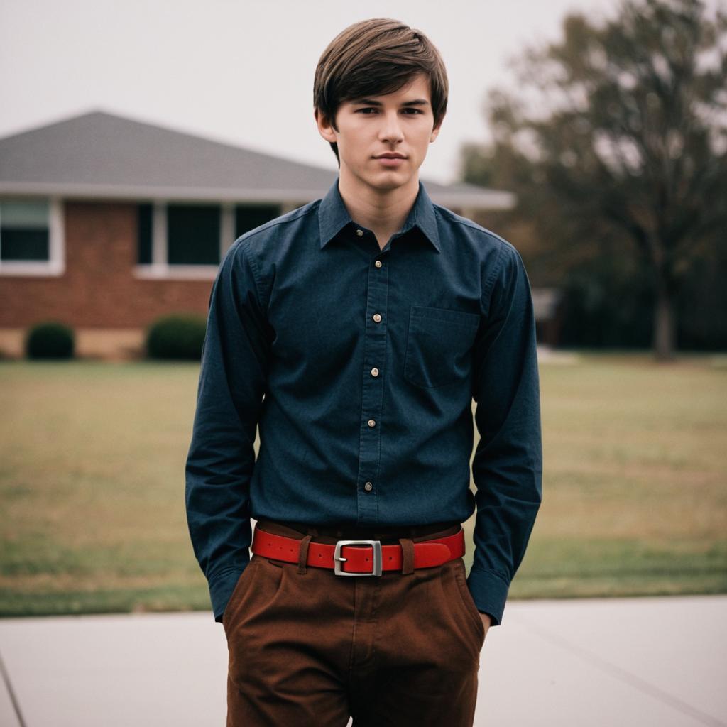 Portrait of a young man standing outdoors wearing a navy blue collared long-sleeve shirt, brown pants with a distinctive red belt. The background shows a suburban setting with a blurred house and trees. The man has short brown hair and a serious expression with a closed mouth.