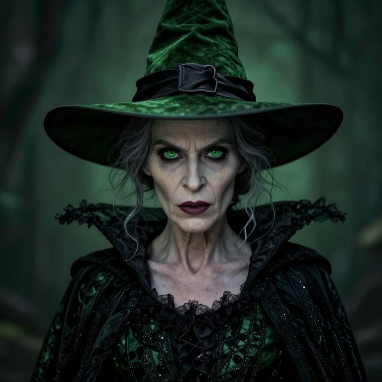 The image depicts a striking figure, likely representing the Wicked Witch of the East, characterized by a dark, eerie atmosphere. The subject is adorned in a wide-brimmed, green witch's hat with a twisted, dark ribbon, adding to the ominous aura. The hat's brim casts a shadow, enhancing the mysterious and foreboding mood. The witch's face is aged and weathered, with deep wrinkles and a stern expression, accentuated by striking green eyes that seem to pierce through the viewer. Her hair, a mix of gray and black, is tousled and unkempt, further emphasizing her formidable presence. She wears a dark, lace-trimmed cloak that drapes over her shoulders, contributing to the overall sense of mystery and power. The background is a muted, dark green, which contrasts with the witch's pale skin and dark attire, making her stand out prominently. The overall composition is balanced, with the witch centrally positioned, drawing the viewer's attention directly to her intense gaze and commanding presence.