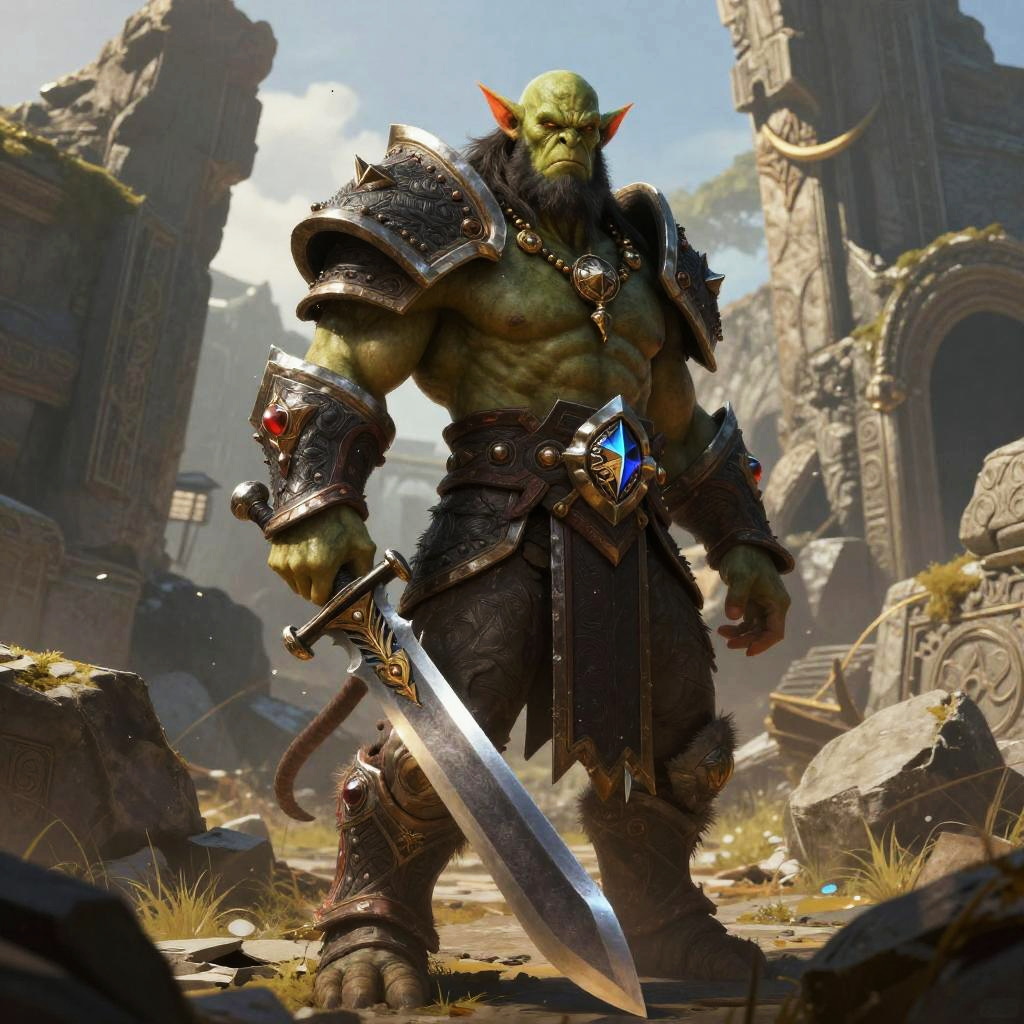 Realistic photo.Illustration an Orc blade master. He looks like blade master in World of Warcraft. ancient ruins realistic photo