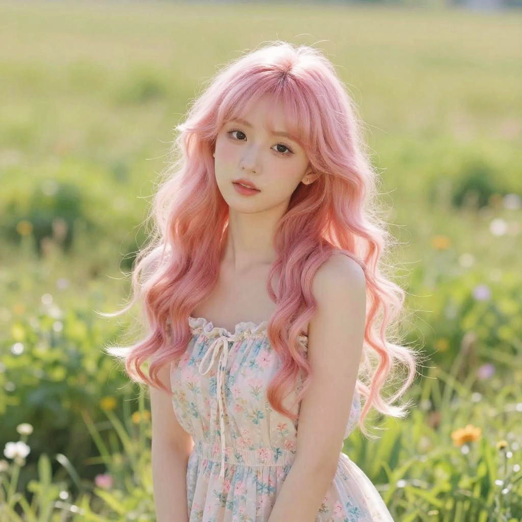 Pastel pink hair girl with soft curls, wearing a delicate floral dress, standing in a sunlit meadow, dreamy and whimsical atmosphere, vibrant and ethereal colors