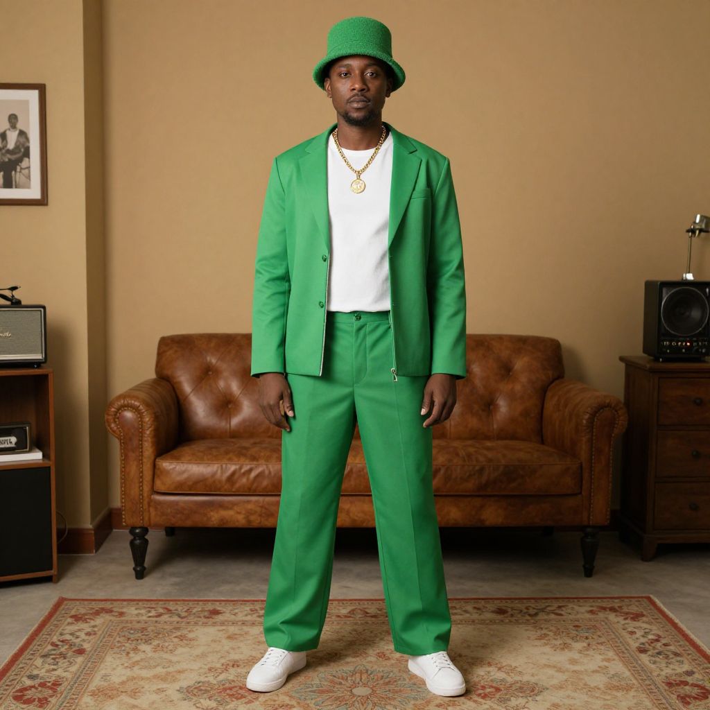 Green Hip Hop Costume, man in green pants and a green hat standing in a room