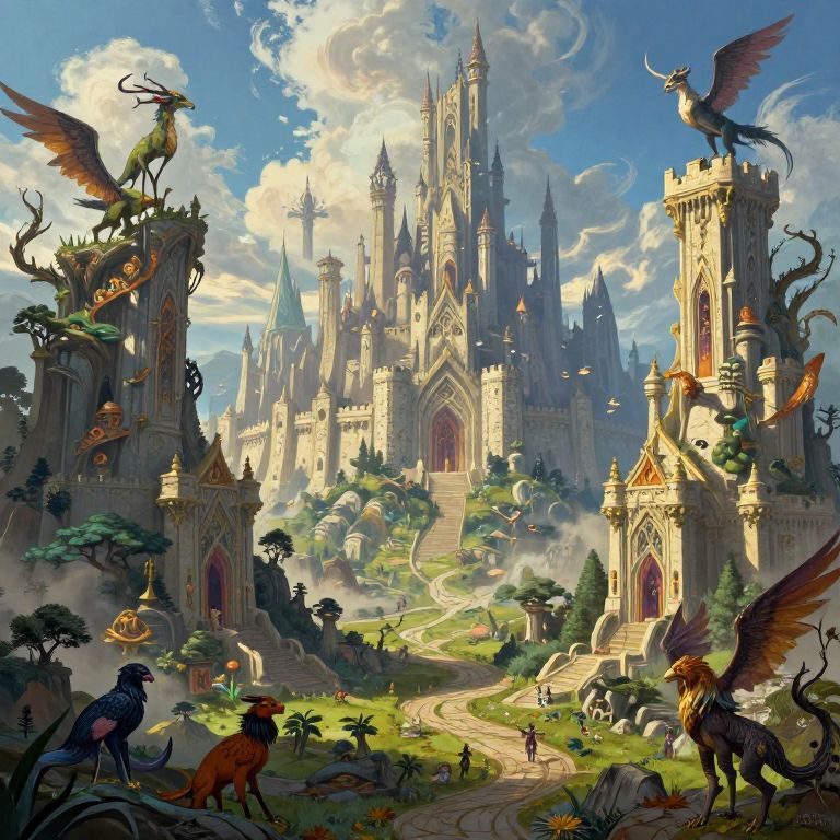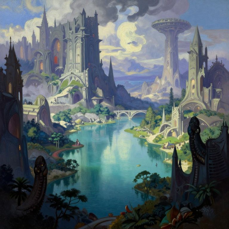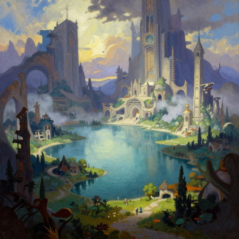 Expansive sci-fi landscape in the style of Frank Frazetta, featuring the tranquil Lake of Serenity, A sweeping panoramic view rendered as a digital artwork, blending classic gothic and baroque fantasy elements, Vibrant colors and illustrative techniques create a painterly effect reminiscent of a highly detailed matte painting, The scene is bathed in atmospheric haze and dramatic lighting, evoking the mood of a vintage oil painting with a contemporary digital twist