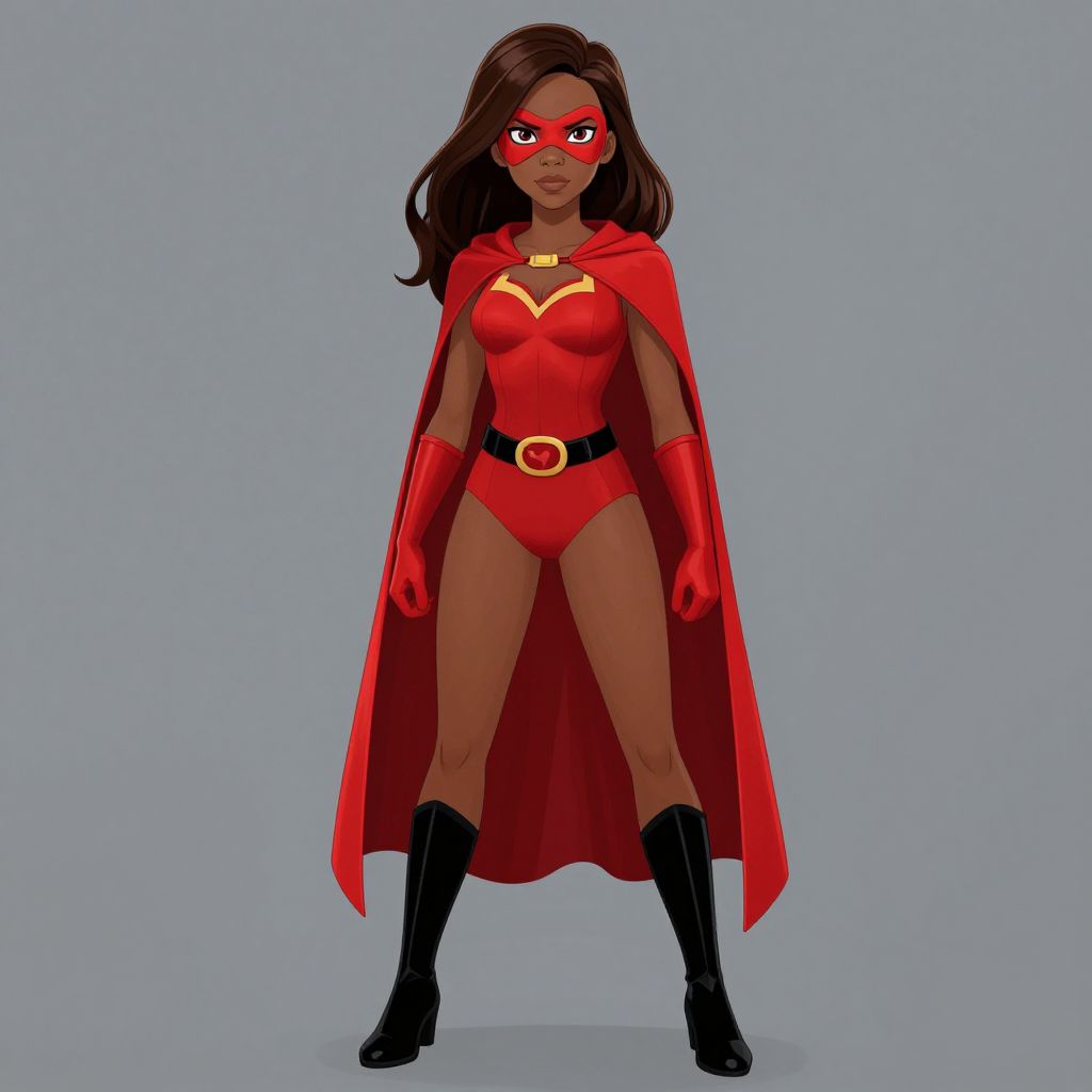 Digital art of a confident Black woman superhero with red mask, bodysuit, cape, gloves, and boots, standing against a gray background.