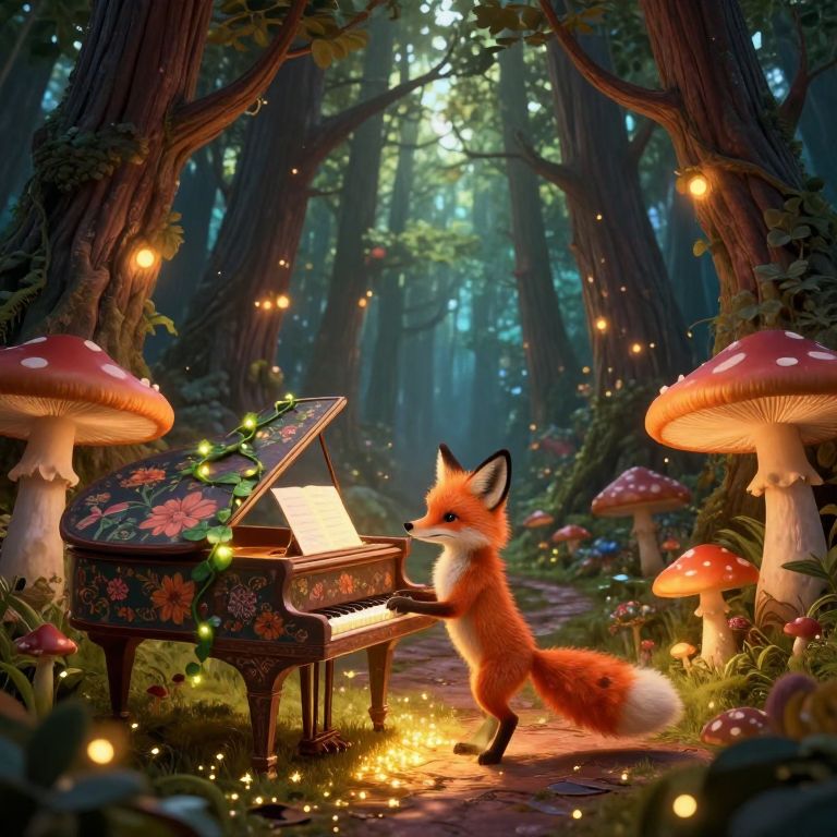 A whimsical digital art piece showcases an enchanted forest from a surreal 'bug's-eye view', where towering trees with glowing bark stand majestically above a winding path lined with oversized, vibrant mushrooms. At the heart of this magical scene, a curious young fox plays a grand piano adorned with intricate floral patterns and glowing ivy vines. The keys emit soft golden light that dances across the forest floor, casting a warm and enchanting ambiance, evoking feelings of wonder and joy as the fox skillfully crafts melodies that resonate throughout this captivating, dreamlike realm.