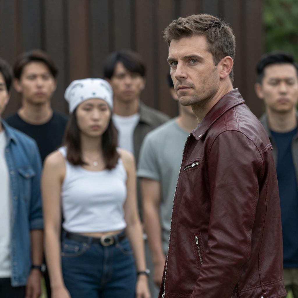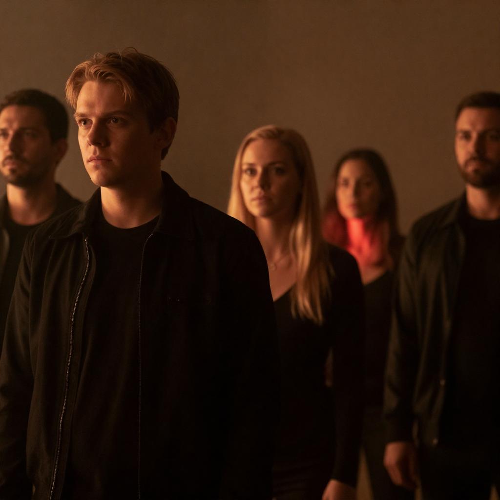 Photograph of a dimly lit group of five people. A young man with short, light brown hair in a black jacket stands in the foreground, slightly left. Behind him, a blonde woman with long hair and a dark top, a woman with brown hair and a red glow, and two men with beards are visible. Warm, orange lighting creates a moody atmosphere.
