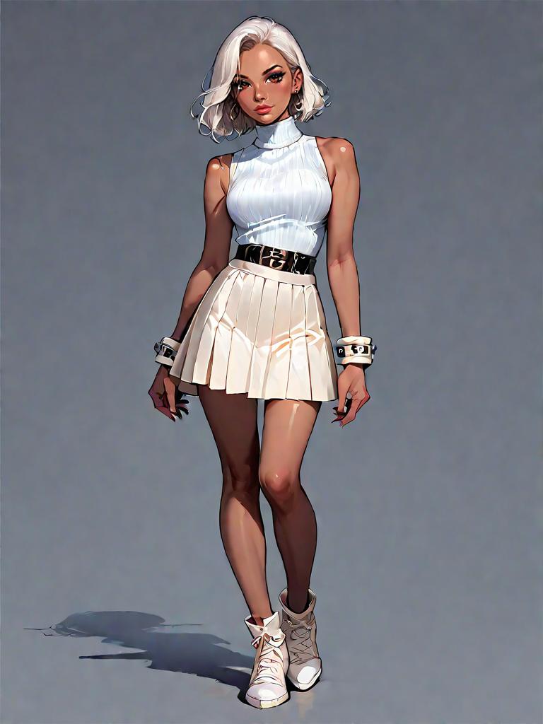 Digital art of a stylish young woman posing confidently against a bright sky background with a pink and blue circular pattern. She is wearing a black sleeveless crop top with a deep neckline, a black midi wrap skirt featuring diagonal tan stripes and an asymmetric hemline, paired with glossy black ankle boots. Gold cuff bracelets accent her wrists, and her dark hair is styled up with colorful hair clips. The image showcases a chic, modern fashion look.