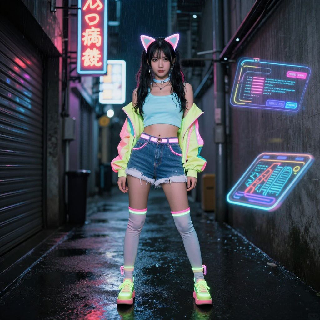 Neon-lit alleyway photograph of an Asian woman with long black hair, cat ears, neon jacket, crop top, denim shorts, thigh-high