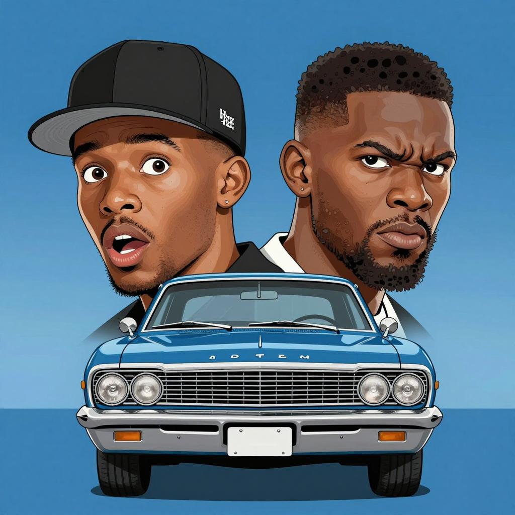 Digital illustration of two African American men in front of a blue classic car. The man on the left wears a black baseball cap, with an open mouth and surprised expression. The man on the right has a short beard and a fierce, angry expression. The car has a visible license plate. Blue gradient background.