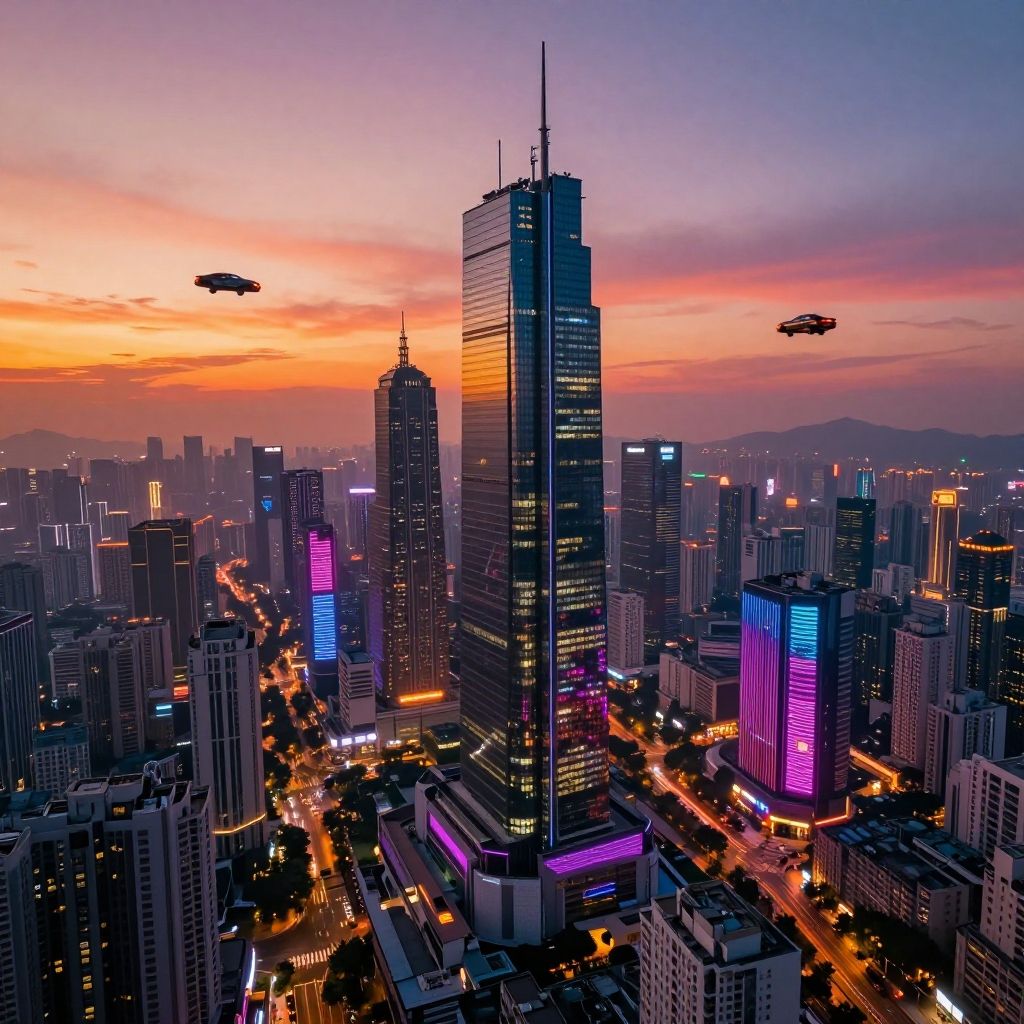 Photograph of a futuristic cityscape at sunset, featuring a skyline dominated by tall skyscrapers with illuminated neon lights in purple and blue hues. The central building is the tallest, with sleek, reflective glass and two pointed antennas. Two flying saucer-like objects are visible in the sky. The background shows a gradient sunset sky with orange, pink, and purple tones. City streets below are busy with bright, orange streetlights and moving car lights. The overall scene combines modern urban architecture with a sci-fi aesthetic.