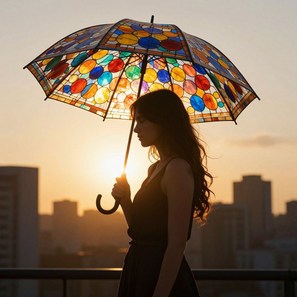 A digital artwork depicts a woman holding a vibrant, stained-glass umbrella adorned with colorful circles, casting a warm, golden glow over her as she stands silhouetted against a cityscape bathed in the soft, dramatic lighting of the setting sun, creating a surreal, cyberpunk-inspired atmosphere where the umbrella shields her from the radiant beams of rainbow light rather than rain.