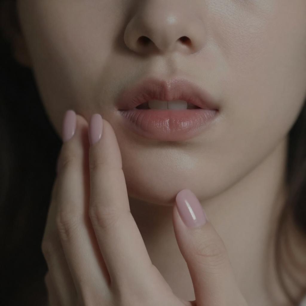Close-up of a woman's face, focused on her parted lips and fingers gently touching her lower lip. Her nails are manicured with a light pink polish. The skin is fair and slightly ured. Dim lighting creates a shadowy background. Her expression is slightly sensual and contemplative. The image highlights her lips and fingers prominently.