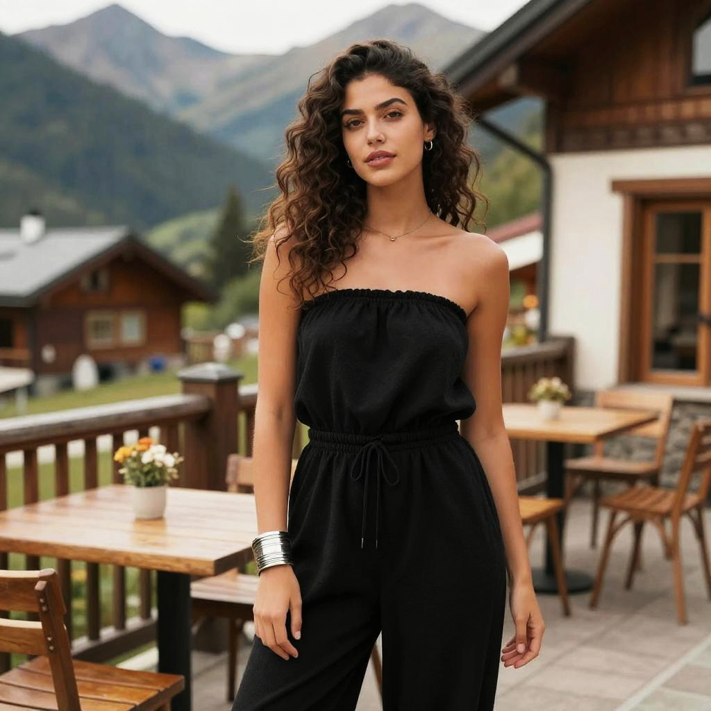 A busty woman in a relaxed bohemian strapless black jumpsuit, cinched at the waist, with wide-leg pants, silver bangle bracelet, and minimalistic stud earrings, stands at a bistro table by a mountain lodge, surrounded by nature. Her natural curly hair flows loosely, embodying a carefree spirit in a production IG visual style. Sexy. Pretty face and beutiful eyes