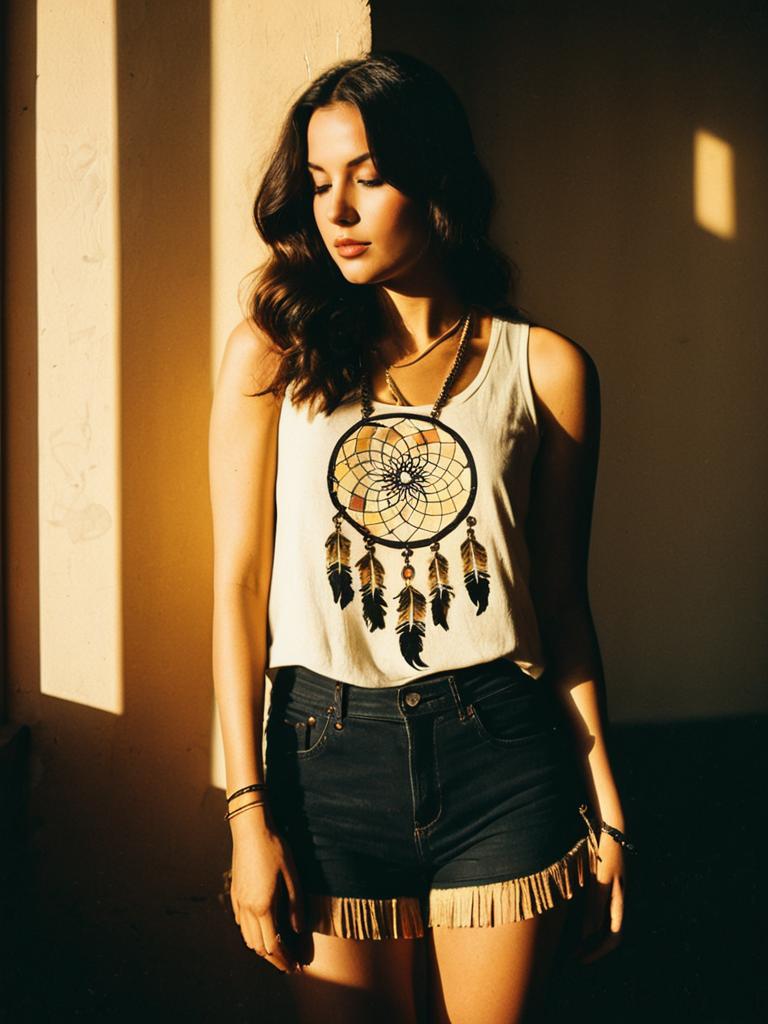 Woman, bohemian, sleeveless cream tank top with dreamcatcher graphic print, crew neck, fringe detail along hem, black denim shorts with fringe hem, layered necklaces, black bracelet. --sref 1405