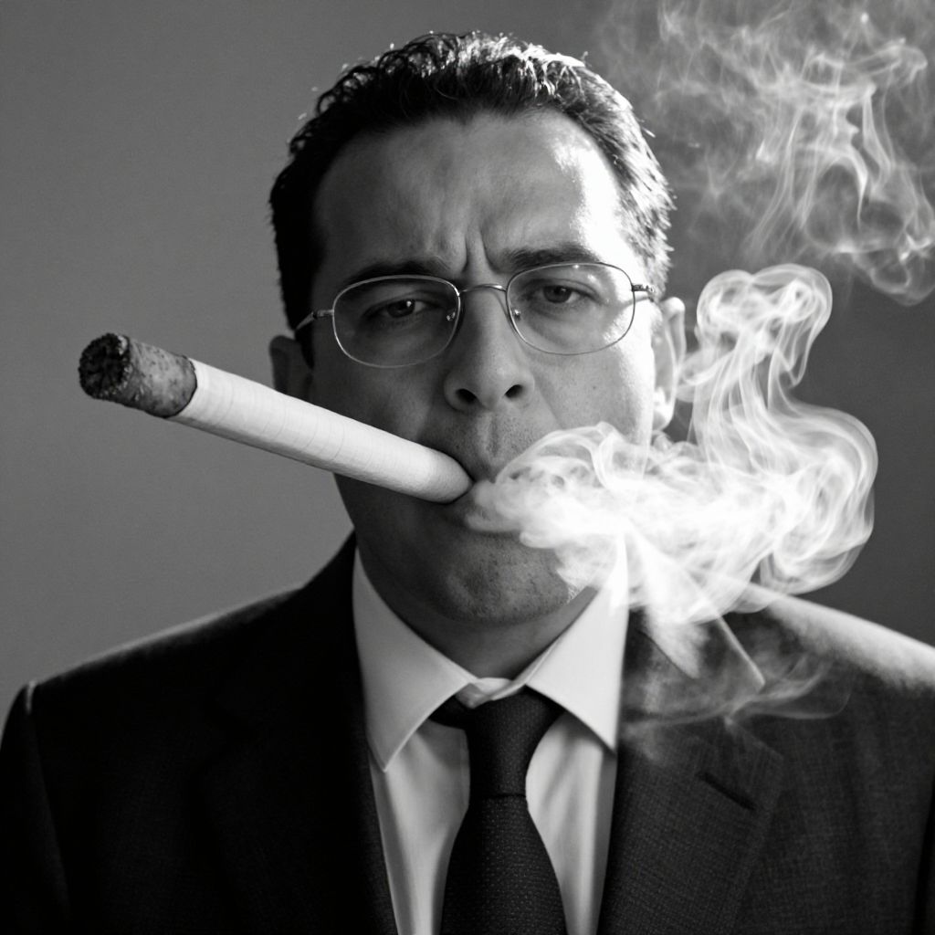 The image is a black and white photograph featuring a man with a stern expression, wearing glasses and a suit. He is smoking a large, thick cigarette that appears to be significantly larger than a typical cigarette, almost the size of an arm. The smoke billows around him, creating a dramatic and somewhat ominous atmosphere. The background is blurred, drawing attention to the man and the smoke. The overall composition is striking, with the man's face and the smoke being the central focus, creating a sense of depth and movement within the frame.