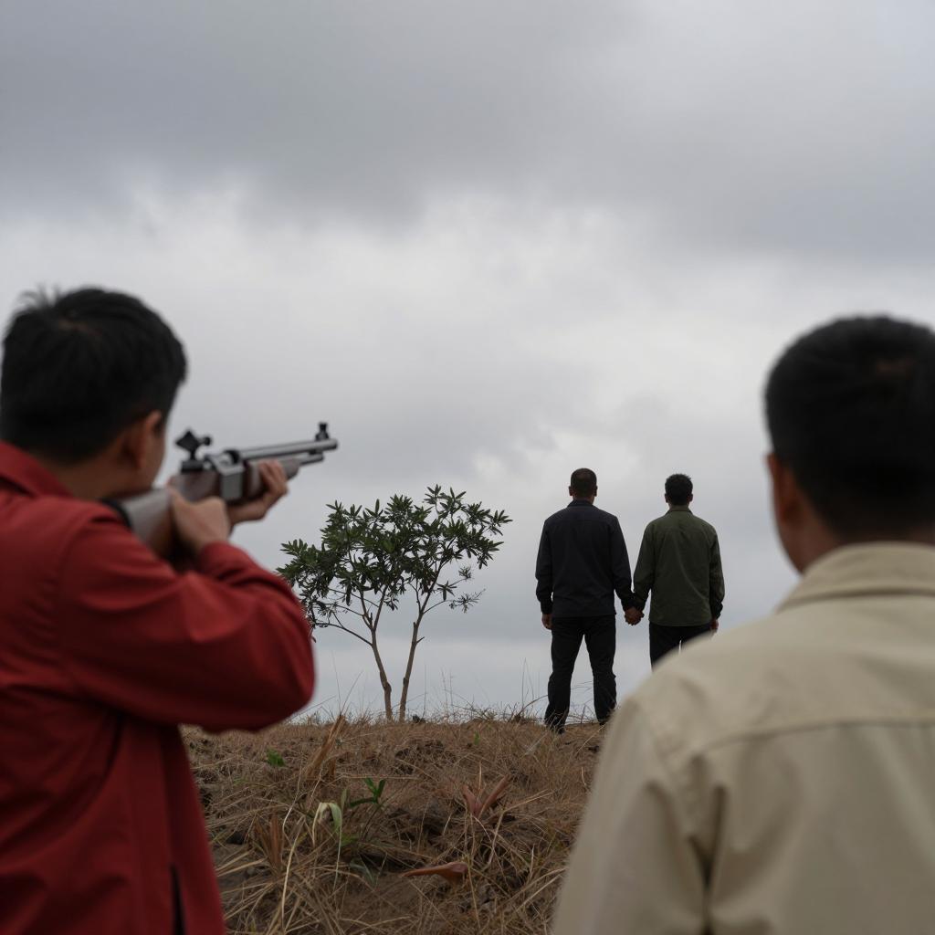Group of six male soldiers in green helmets and uniforms. Front soldier, middle-aged with blond hair, serious expression, light green shirt. Five other soldiers, various ages, serious or neutral expressions. Background: crowd, blurred buildings. Bright daylight.