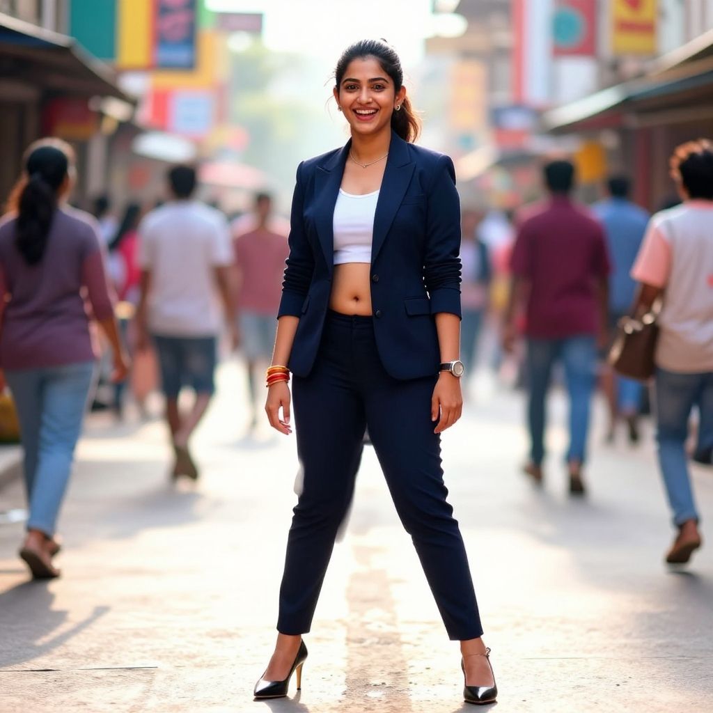 20 years old, extremely beautiful Tamil girl (((full body shot))), (wearing:1.6 tuxedo suit, high heels, wrist watch, bangles, earrings, necklace), ponytail, look at viewers, eyes symmetry, face symmetry, (((round deep navel))), (best quality, ultra-detailed:1.6), colorful scene, bright color palette, playful atmosphere, vibrant colors, cute expressions, joyful laughter, body reflecting light, back lit, refreshing ambiance, happy face, natural lighting, candid moments captured, lively mood, standing on the streets of busy city, (intricate detailing:1.6 faces & eyes & ears & nose & lips & skin & curves & round deep navel & midriff & body parts), HDR, hyper realistic, yocto-pixel detailing, yotta-pixel image