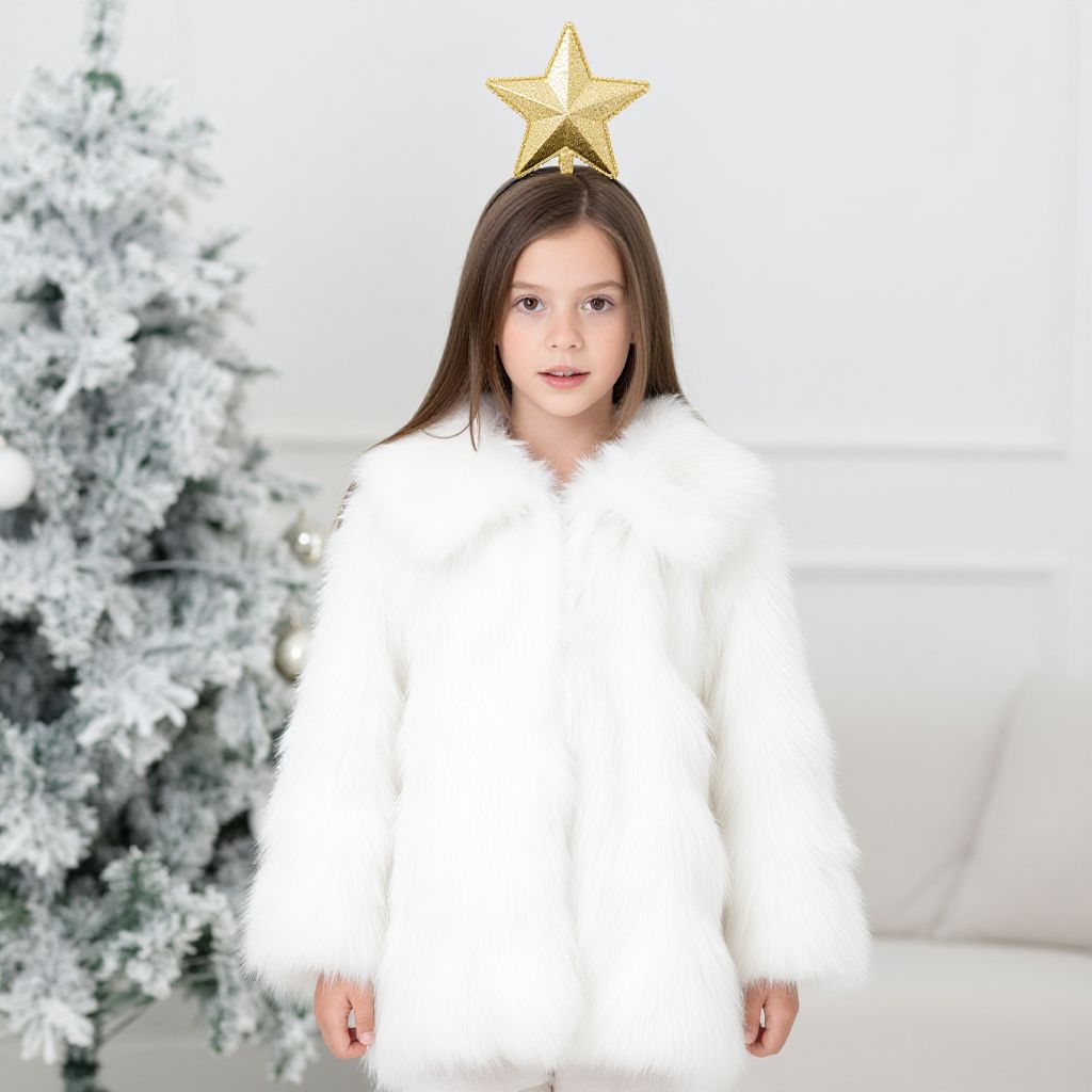"White Christmas Tree Costume, dressed in a white fur coat and a star on his head"