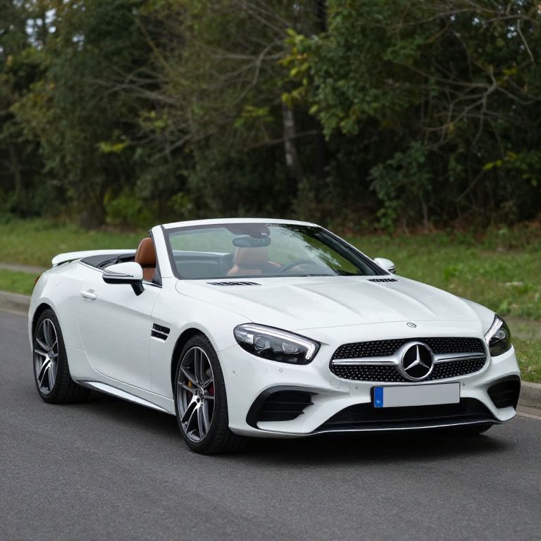 Photograph of a sleek, white Mercedes-Benz convertible with black accents and blue racing stripe, driving on a road through a forest.