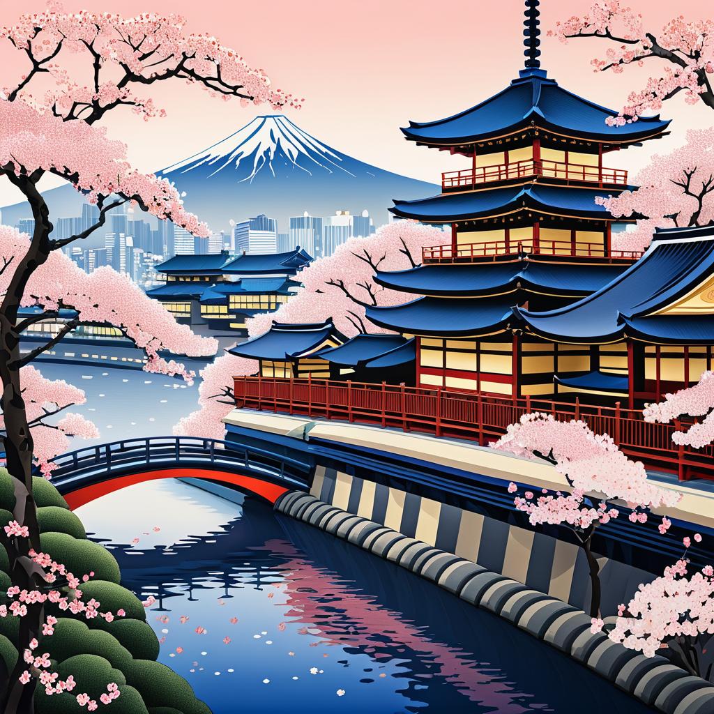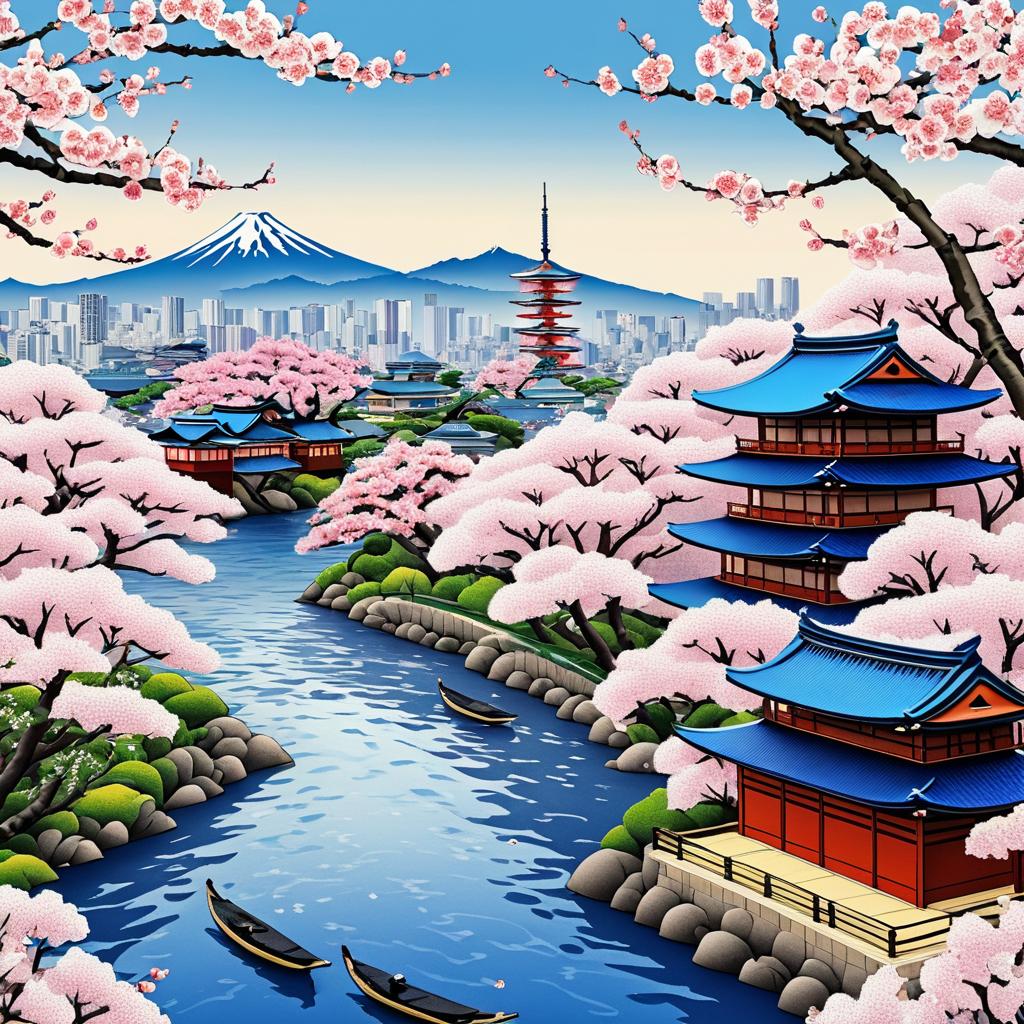 Fine detail painting of Tokyo during cherry blossom season featuring traditional Japanese pagodas with blue roofs, blooming pink cherry blossom trees, a river with small boats, and the iconic Mount Fuji in the background. The city skyline is visible beyond the natural and architectural elements, rendered in the style of Hokusai with intricate and ornate details.