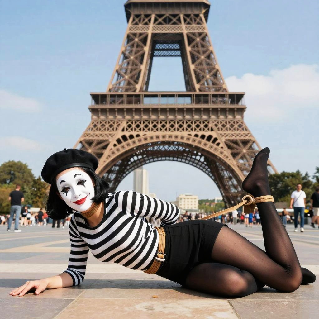 Hogtie bondage, crossed ankles, French mime woman, wearing a black beret, black bob haircut, striped shirt, black tights, black socks, laying on stomach, arms behind back, mime makeup, low angle, smiling, pixiv anime, realistic cgi, full body, 8K wallpaper, wide angle, outdoors, Eiffel Tower, masterpiece, best quality, extremely detailed, highres, surrounded by crowd, feet
