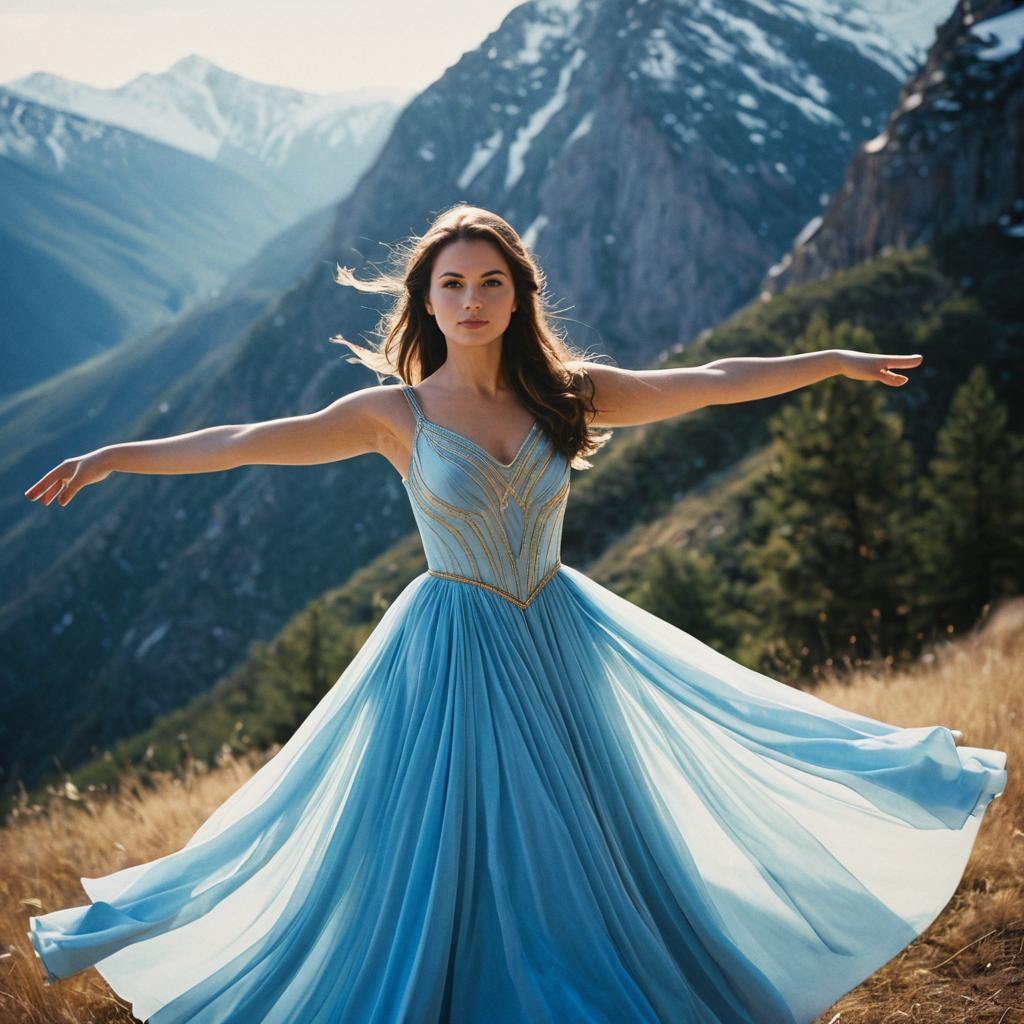 Light blue lyrical costume,1girl, solo, dress, outstretched arms, brown hair, brown eyes, realistic, mountain, blurry, outdoors