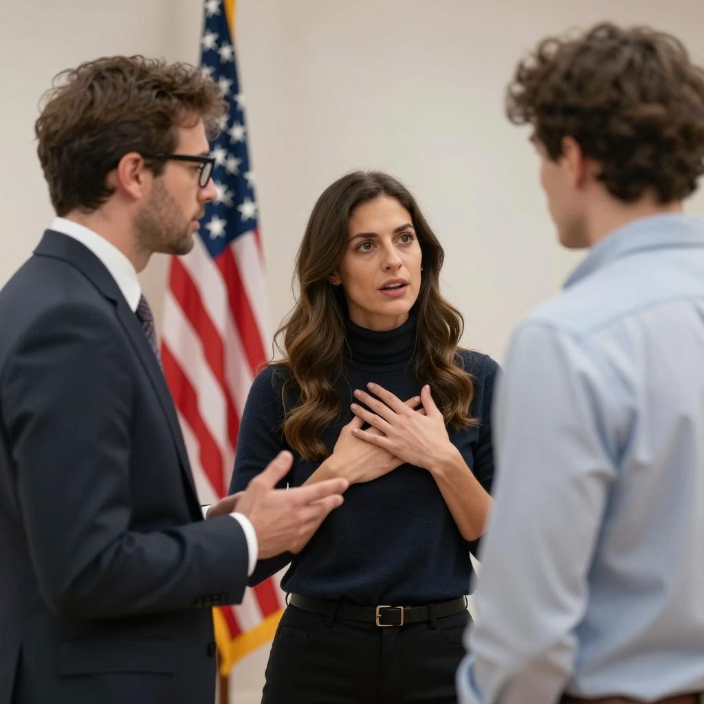 Group of six people on a city sidewalk. A man with short dark hair, striped shirt, and blue jeans gestures to the left. Behind him, four men in business and casual clothes, one with glasses. To his right, a woman with long brown hair in a white top and brown cardigan, another woman with red hair and a floral dress. Background includes greenery, parked car, and street. Two men have intense expressions.
