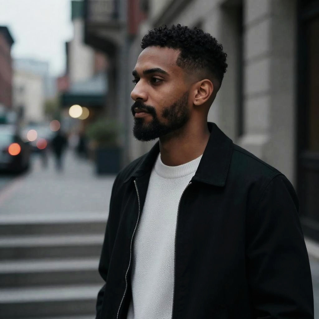 A man with short curly top with tapered sides and balbo beard wearing a black jacket over a white sweater, standing outdoors on a city street with steps and blurred buildings in the background, bokeh street lights, moody lighting, shallow depth of field, cool color tone, muted colors, high contrast, cinematic style, soft bokeh background, urban atmosphere, natural skin tones