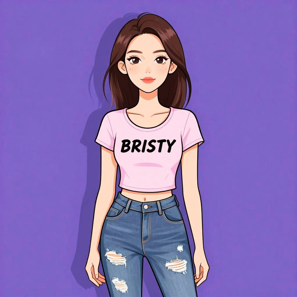 Woman with pretty face and pretty hair. Woman, casual, graphic t-shirt with slogan in black lettering, scoop neck, short sleeves, light pink color, tucked into distressed skinny jeans, mid-rise, faded wash, ripped details on legs, no visible accessories. --sref 1467