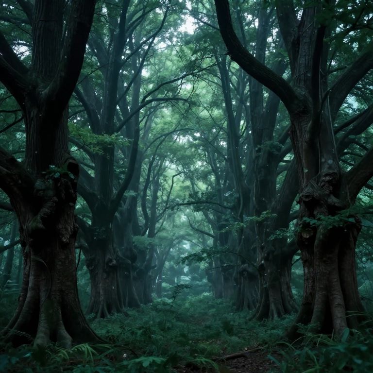 Photograph of a dense, misty forest with tall, dark tree trunks and lush green foliage, creating a mysterious, ethereal atmosphere.