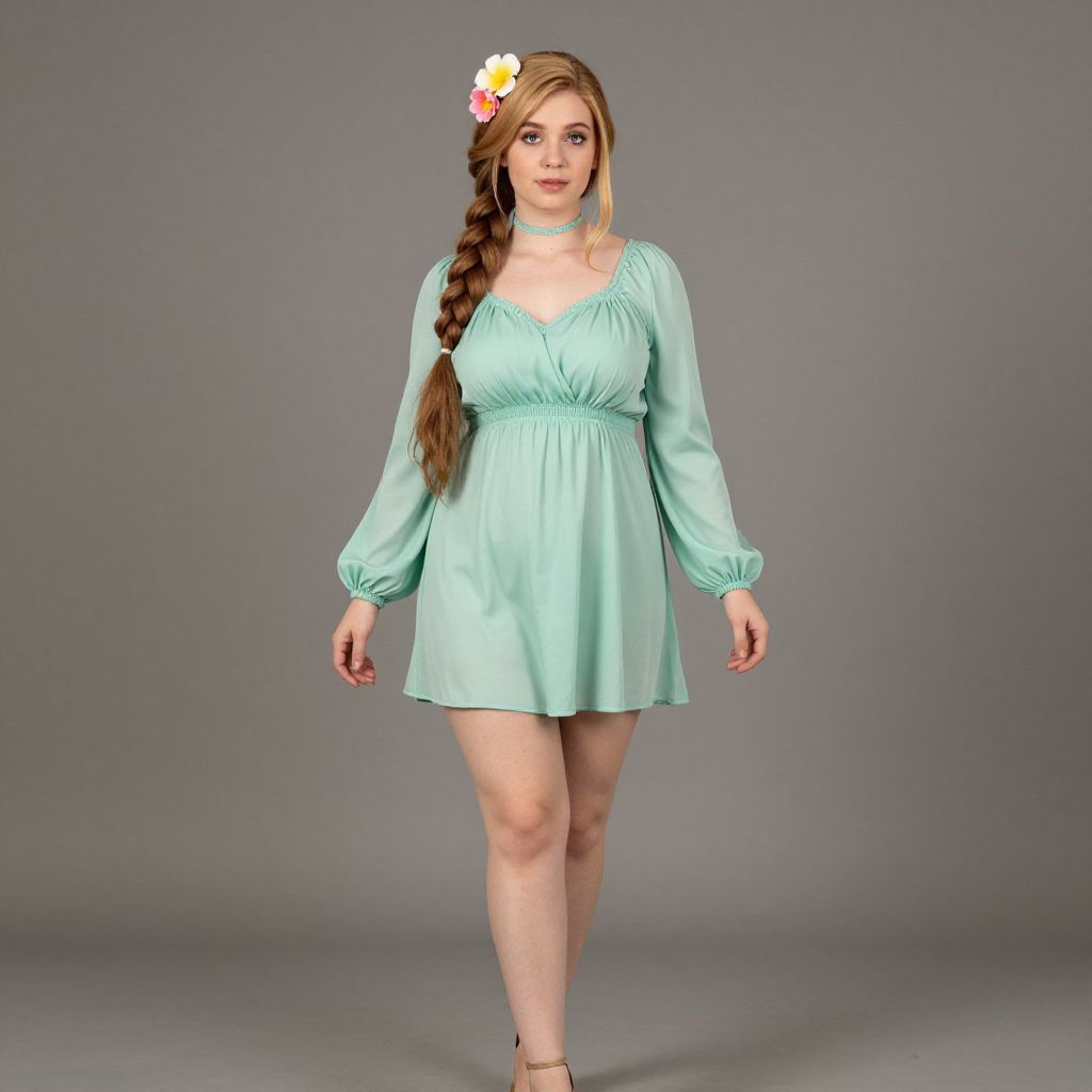 Photograph of a young Caucasian woman with fair skin and long, light brown hair in a loose braid adorned with colorful flowers. She wears a mint green, long-sleeved, knee-length dress with a gathered waist and puffed sleeves. She has a slender build and stands against a plain gray background, facing forward with a neutral expression. She wears a thin, choker-style necklace and beige ballet flats. The lighting is even, highlighting the soft texture of her dress and the smoothness of her skin.