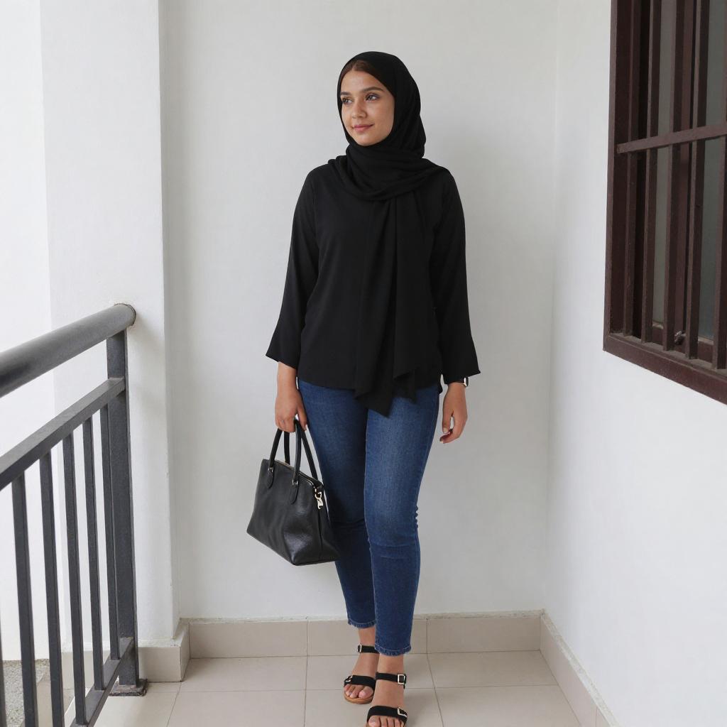 Photograph of a young woman with light skin and brown hair, wearing a black hijab, black long-sleeve top, and dark blue jeans, standing against a white wall in a narrow, tiled corridor. She holds a black purse in her right hand and wears black sandals. The corridor has a metal railing on the left and a window with bars on the right.