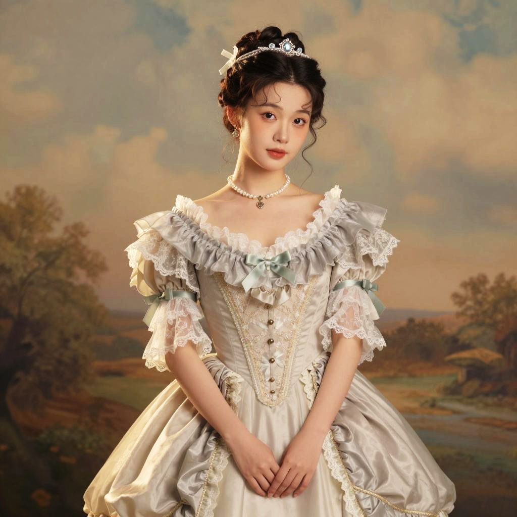 This enchanting image features a woman dressed in a beautiful vintage gown, embodying a classic romantic style. Set against a picturesque landscape, she exudes elegance and grace, evoking a sense of timeless beauty inspired by historical periods.