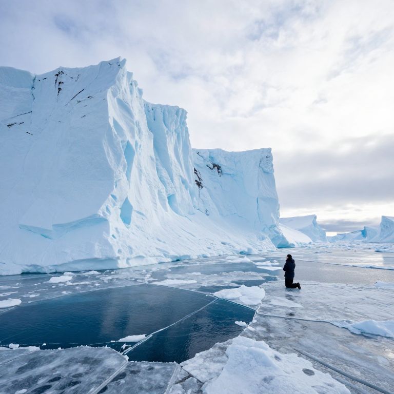 Photograph of a lone person in dark clothing standing on an icy, snow-covered landscape with towering, white glacier ice formations. Overcast sky.