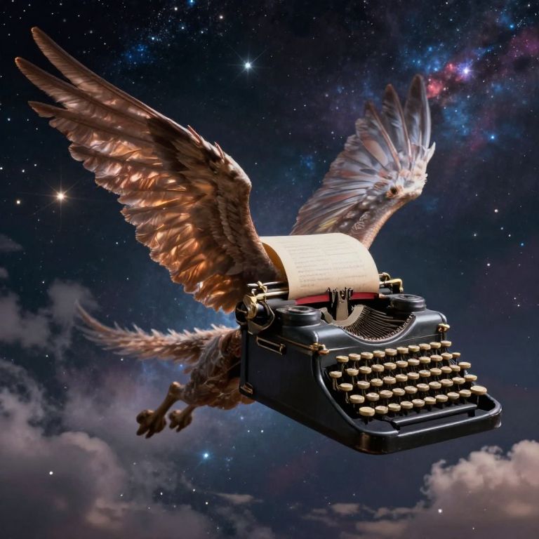 A majestic, winged creature soars through a cosmic expanse, defying gravity as it carries an enormous vintage typewriter, its keys poised to weave celestial stories amidst the stars and clouds.