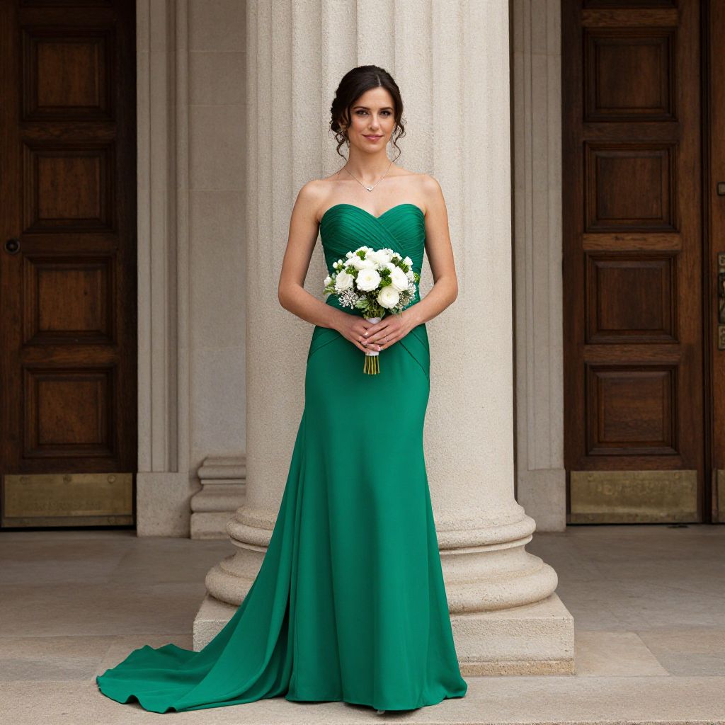 Elegant woman in a strapless emerald green wedding dress stands gracefully against a classical stone column, holding a delicate bouquet of white flowers and greenery, with a vintage doorway flanked by wooden panels in the background.