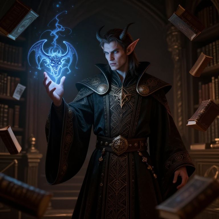 Photorealistic digital artwork of a dark-haired, horned, elf-like mage in ornate black robes, conjuring a glowing blue, ethereal