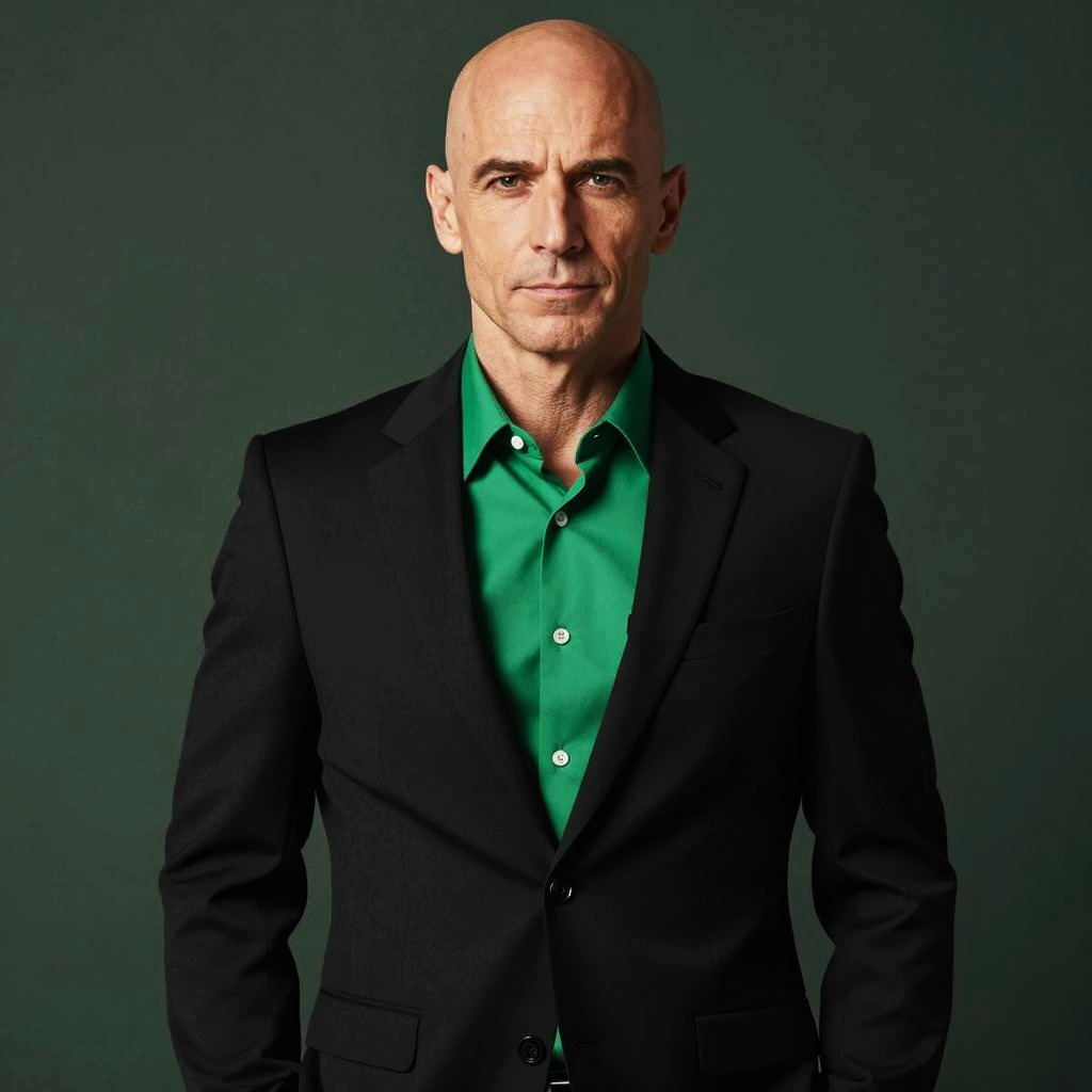 A confident bald man stands against a dark green background wearing a sleek black suit paired with a vibrant green shirt. The portrait features dramatic lighting that highlights his strong facial features and professional attire, evoking a modern and stylish vibe.