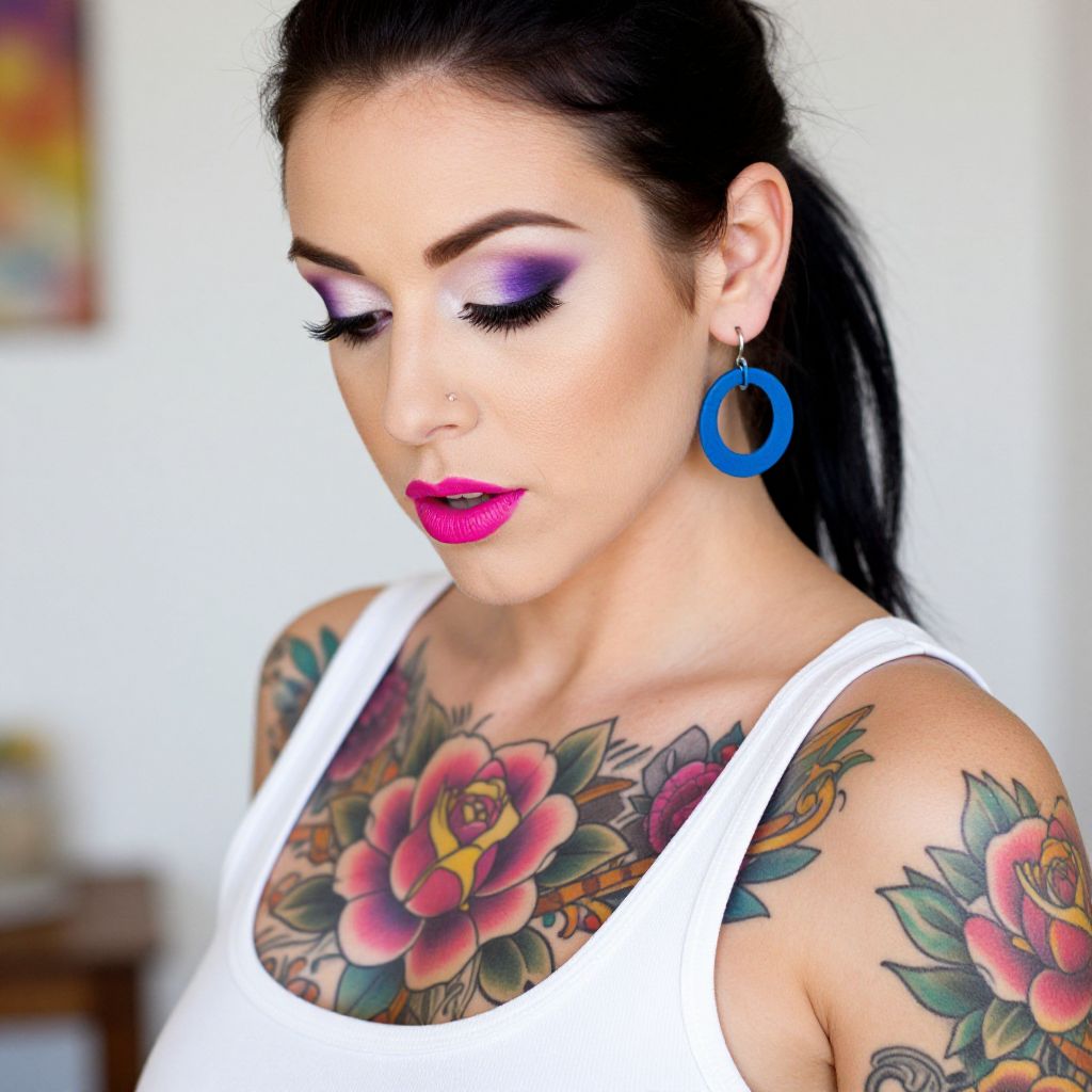 Photograph of a tattooed woman with dark hair in a ponytail, looking down. She has vibrant pink lips, heavy purple and white eyeshadow, and blue circular earrings. Her upper chest and shoulder are covered in colorful tattoos, including a large pink and purple rose and intricate floral designs. She wears a white tank top. The background is blurred and white.