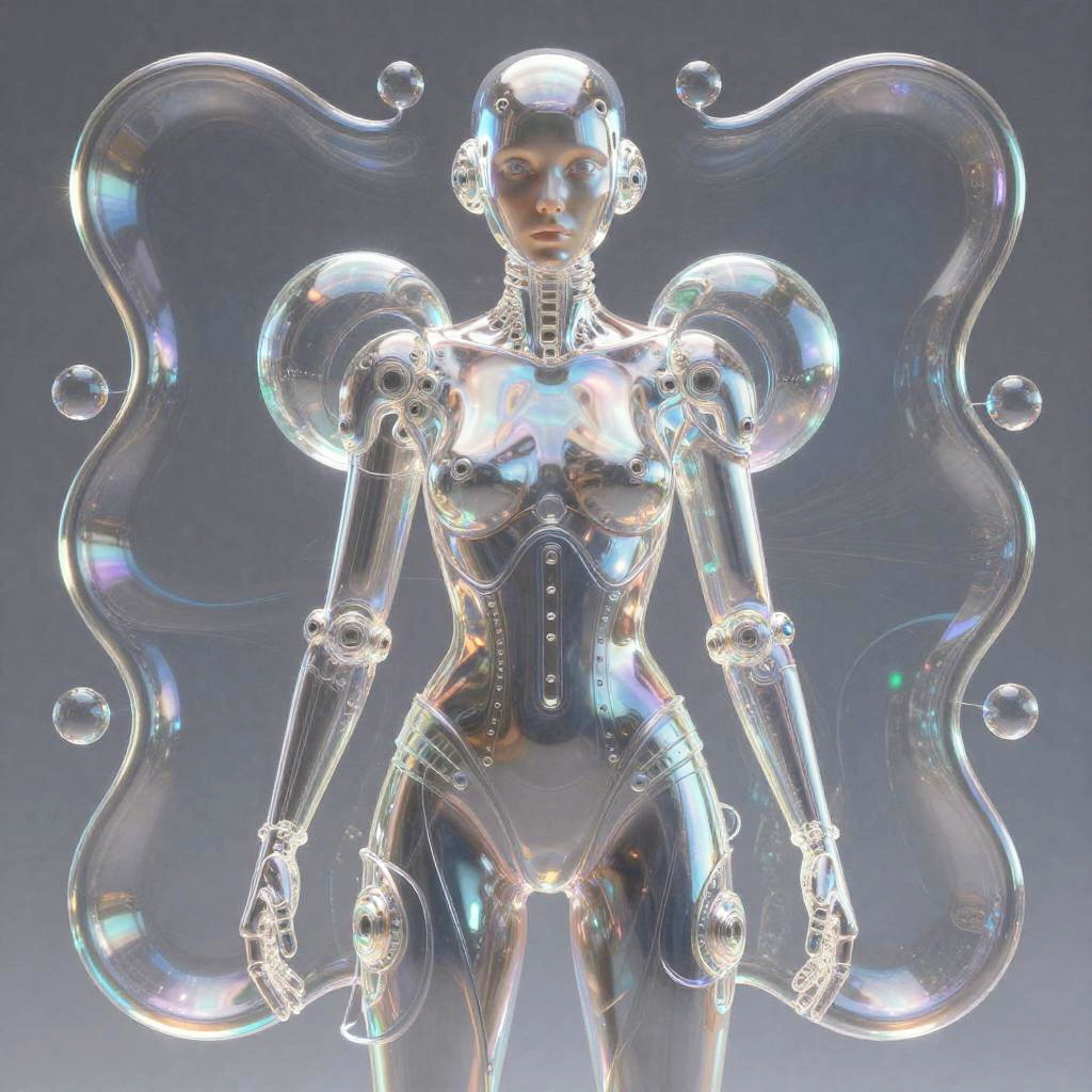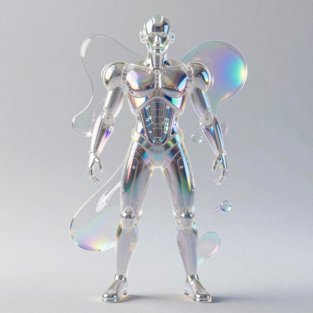 Realistic photo.Abstract glossy, fluid-like transparent 3D HD 8k centered, a man with a futuristic biomechanical shapes and a futuristic iridescent panels, inspired by Alberto Seveso, very shiny, carnival glass, holography, iridescent, a hologram, fluid light realistic photo