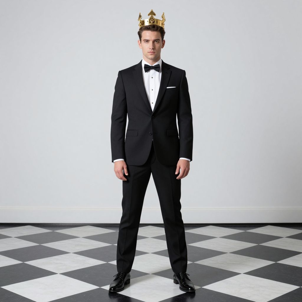 King Spades Costume, man in a suit and crown standing on a checkered floor