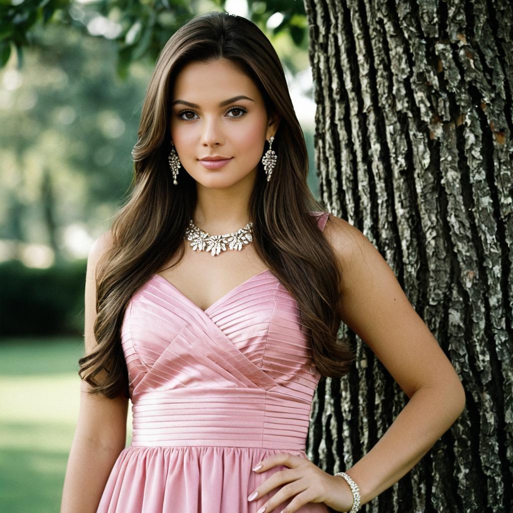 Portrait of a young woman with long brown hair and brown eyes wearing a flowing purple dance dress and transparent pantyhose. She is accessorized with crystal earrings and posing against a textured purple background. The dress features thin straps and a ruched bodice.