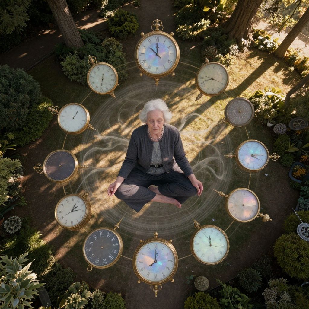 Craft an image that harmoniously blends photorealism with fantastical elements, depicting an elderly woman in deep meditation within a serene garden setting. She is encircled by ethereal, intricate timepieces that seem to levitate and intertwine with her silhouette, blurring the lines between reality and dream as they gracefully orbit around her. This unconventional aerial perspective transforms the garden into a mesmerizing seascape, bathed in golden sunlight filtering through the trees and casting delicate shadows. The shimmering iridescent tones of the clock mechanisms, reflecting the tranquil fusion of the woman and her surreal environment, are illuminated by the dappled light, creating an atmosphere of serenity and wonder.