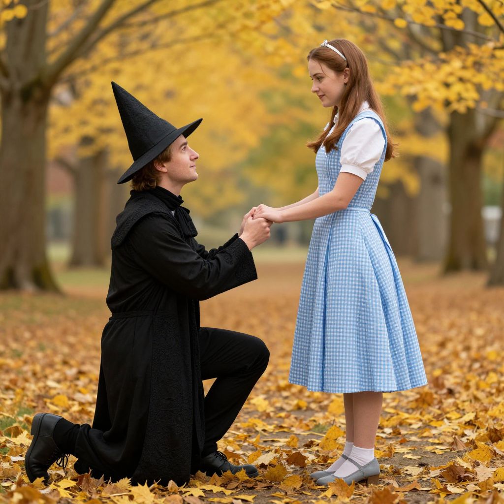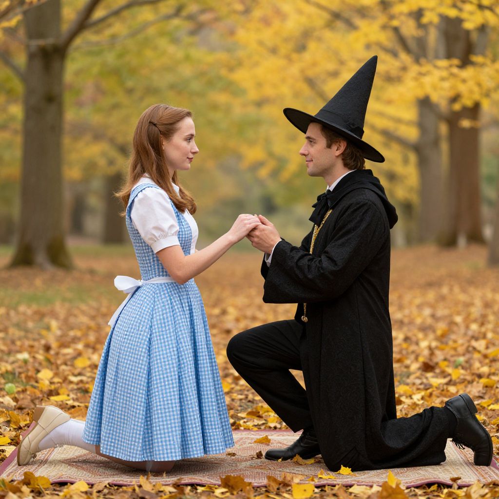 A whimsical, high-definition digital rendering captures a heartfelt \"Wizard of Oz\"-inspired marriage proposal, where a man dressed as a wizard kneels on a carpet of golden leaves, holding hands with a woman in a blue gingham dress reminiscent of Dorothy's iconic attire, set against a vibrant autumnal backdrop.