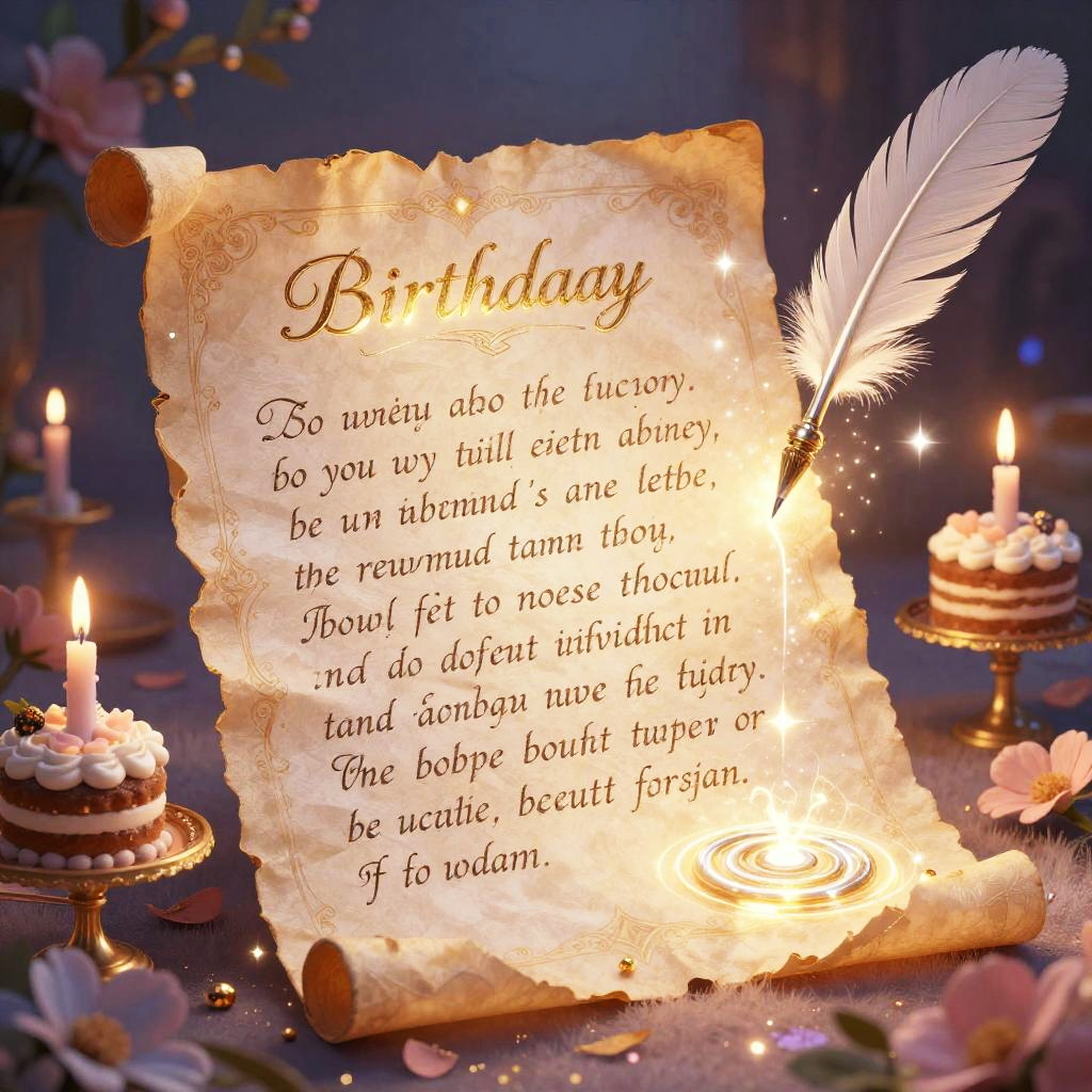 Birthday letter generator in fantasy style, enchanted scroll glowing with magical runes, quill pen floating in air dripping sparkling ink, surrounded by birthday cakes, candles, and mystical flowers, surreal and dreamy atmosphere with pastel color palette, detailed and whimsical