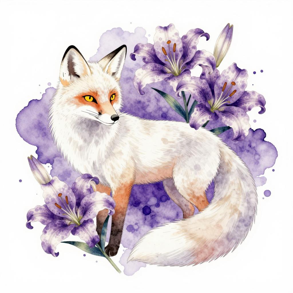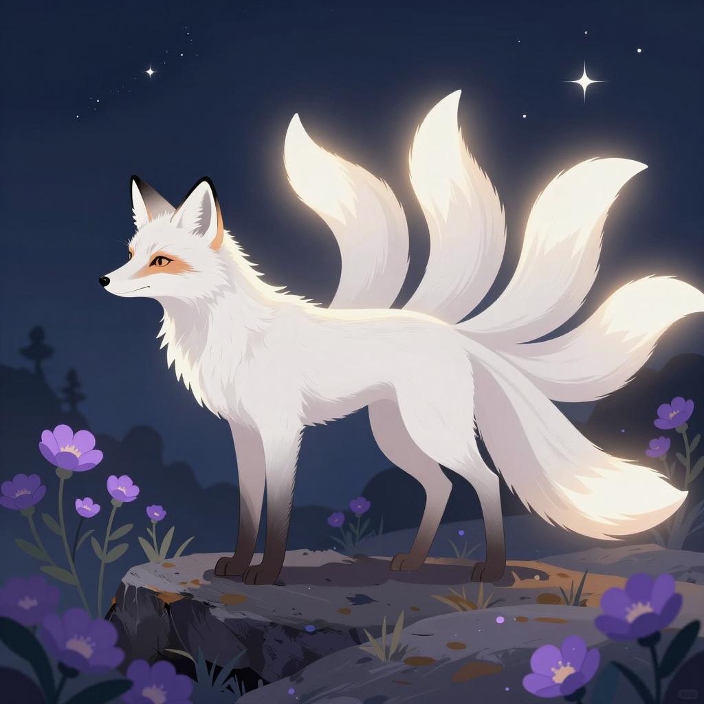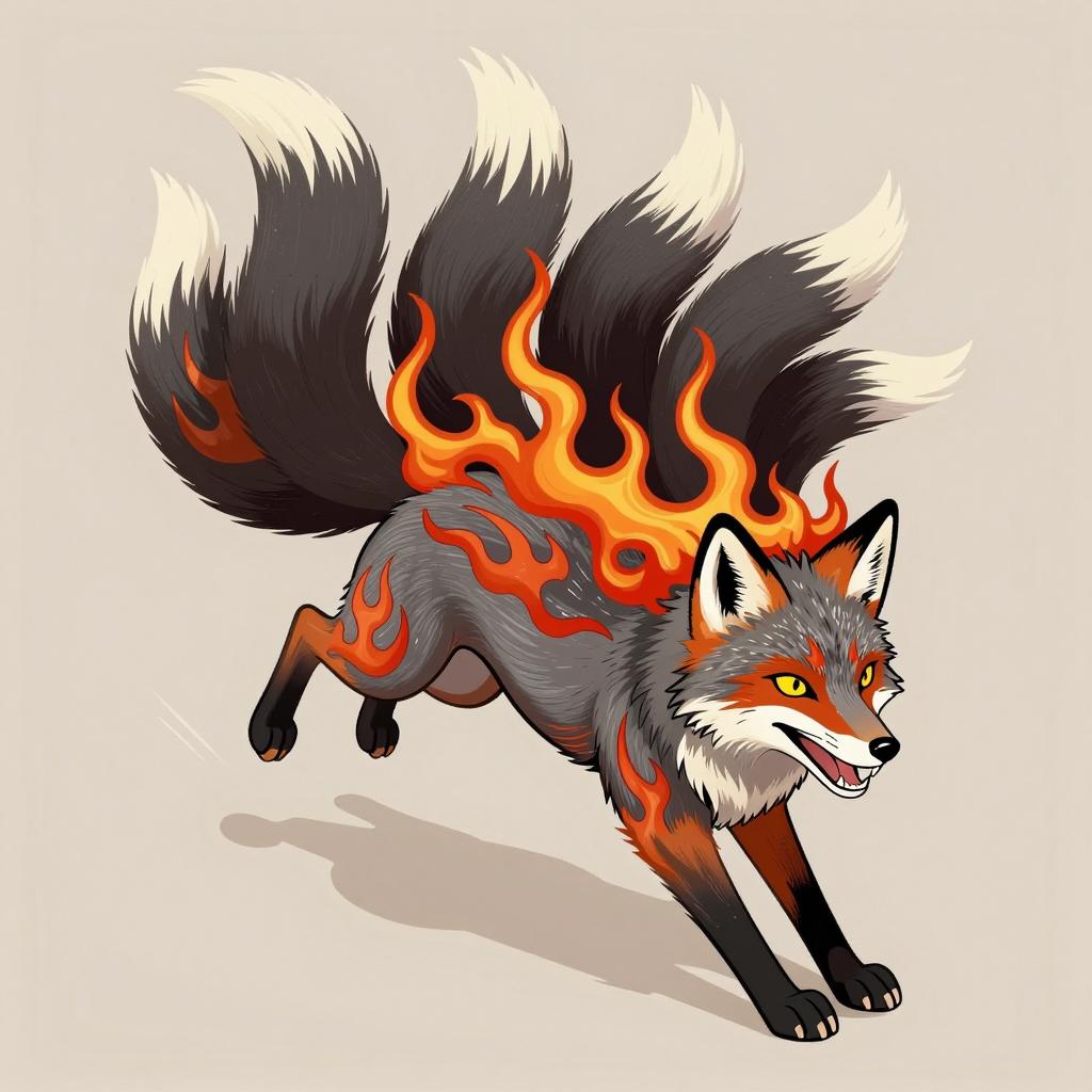 Illustration of a white fox with nine flowing tails, hovering with yellow, flame-like paws. Dark gray watercolor background. Fox's head is down, eyes closed, with black and red markings. Two black and gold pencils in the bottom left. Ink and watercolor style. Artist's "Mika" at bottom left.