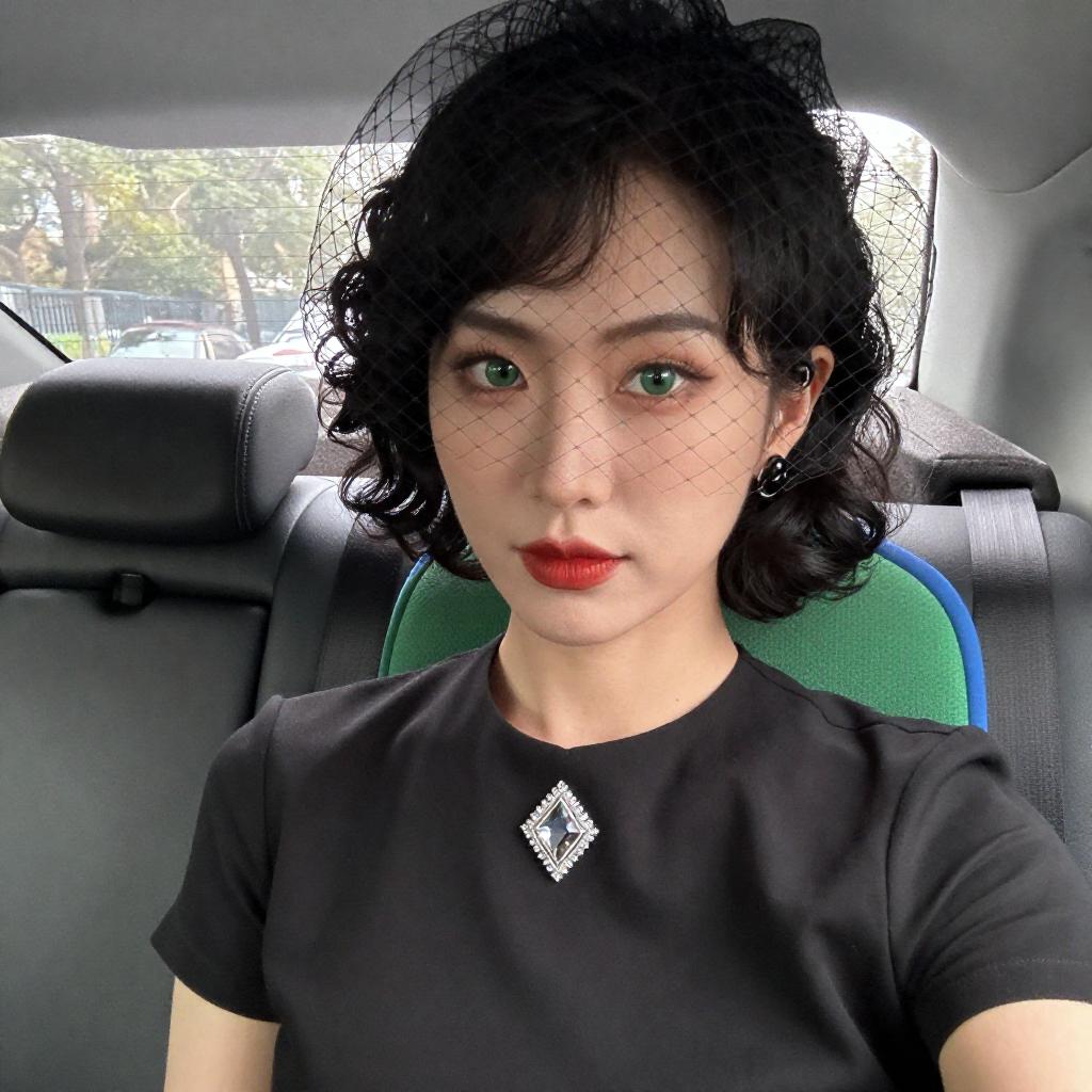 Close-up portrait of a woman with short curly black hair and green eyes, wearing a black dress with a diamond-shaped brooch. She accessorizes with a black mesh veil hat, black earrings, and red lipstick. The woman is seated inside a car with a green and blue headrest visible behind her.