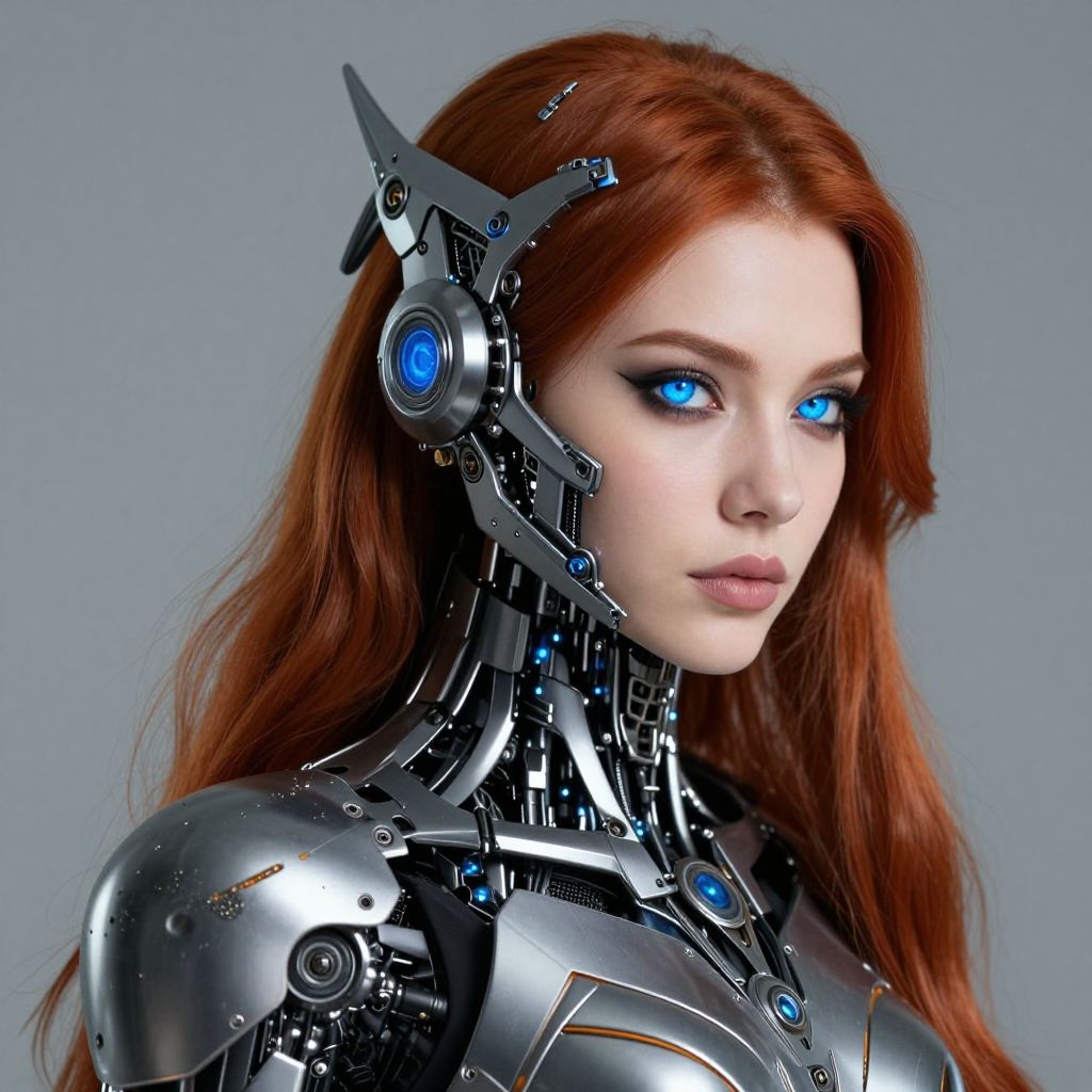 This is a highly detailed CGI image of a young woman with long, red hair and striking blue eyes. She has a futuristic, cybernetic appearance, with metallic armor covering her shoulders and neck, adorned with blue glowing accents and intricate mechanical components. Her left side features an angular, robotic headpiece that integrates with her hair. The background is a simple, solid grey, which emphasizes her futuristic and robotic look. Her expression is neutral, and the texture of her hair is realistic, contrasting with the sleek, metallic texture of her cybernetic armor. The overall style is hyper-realistic with a sci-fi theme.